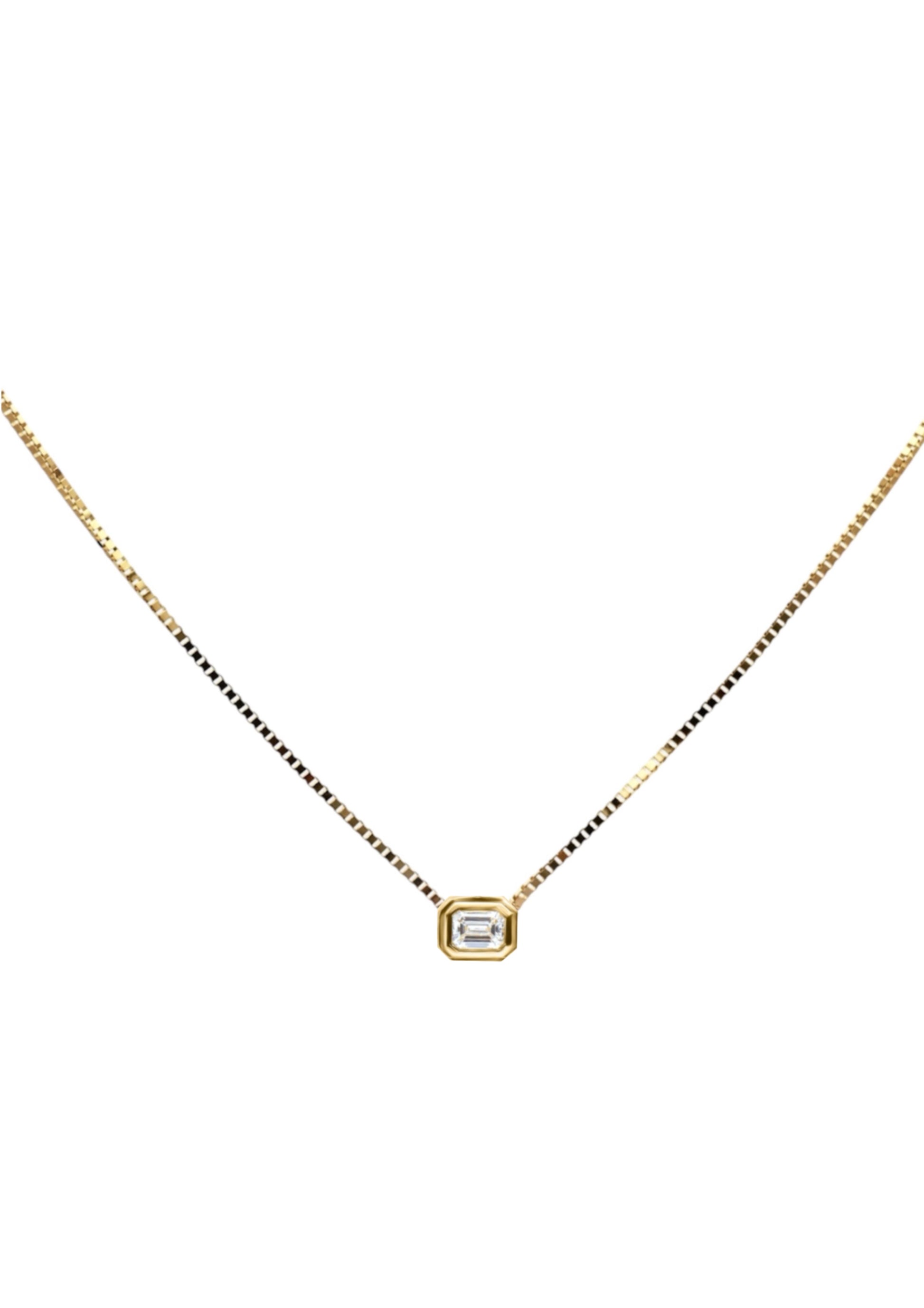 קלאסיקה מודרנית, שרשרת זהב ובמרכזה יהלום מעבדה 0.10 קארט, בחיתוך אמרלד משובץ בבית אבן נקי ומינימליסטי. האיזון המושלם בין עדינות לנוכחות.